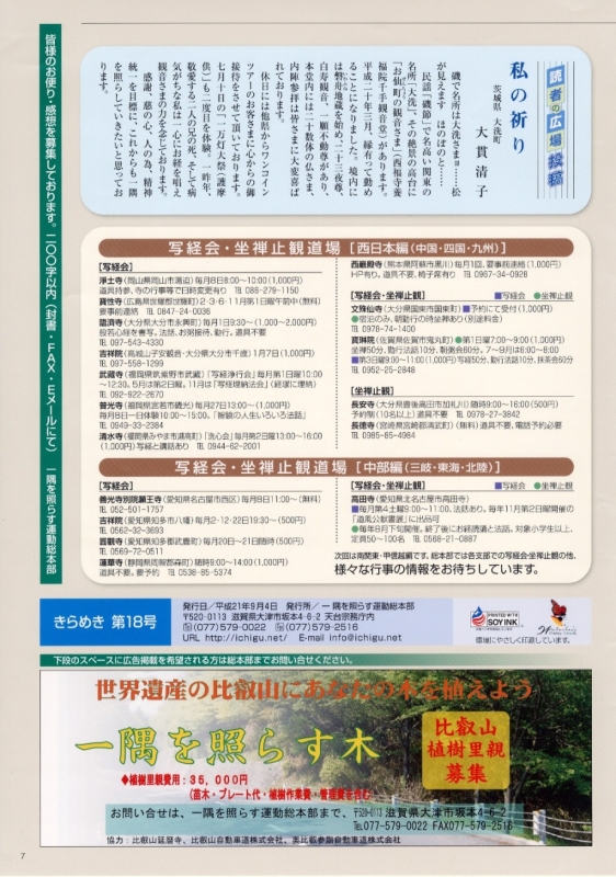 写経会・坐禅止観道場[西日本・中部編] 比叡山植樹里親募集