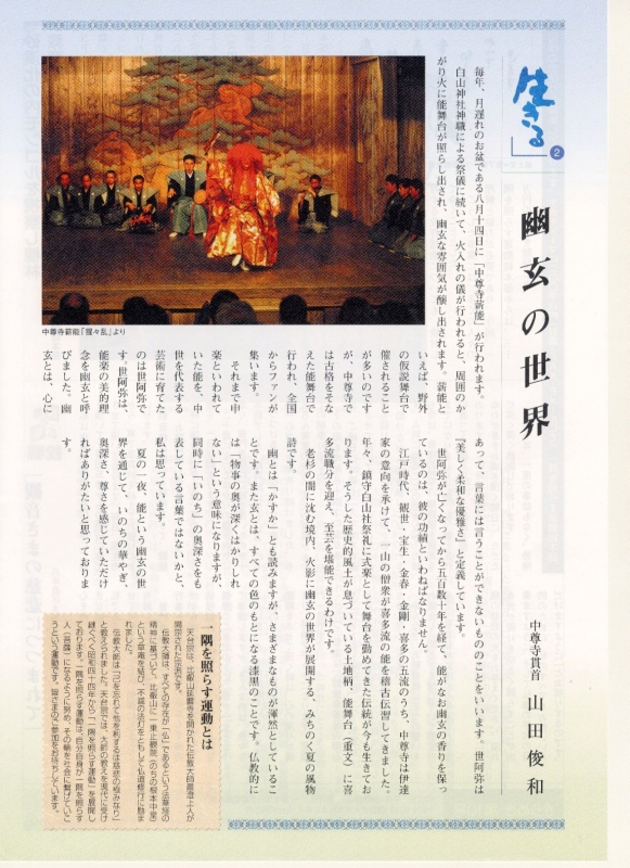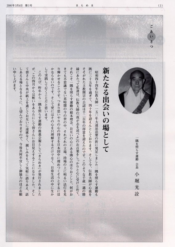 ―新たなる出会いの場として― 昭和44年伝教大師1150年大遠忌法要の折に発足しました一隅を照らす運動も既に35年を過ぎて、40年を迎えんとしております。そして今、伝教大師が