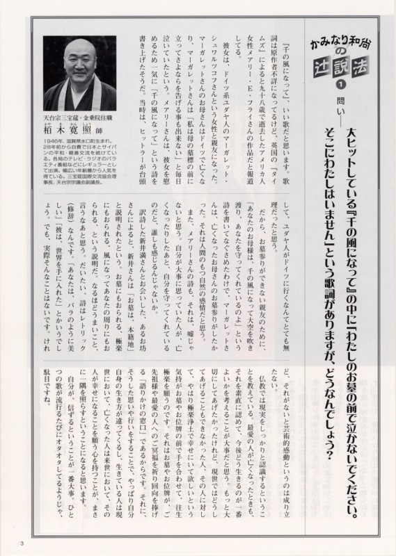 問い-大ヒットしている『千の風になって』の中に「私のお墓の前で泣かないでください。そこにわたしはいません」という歌詞がありますが、どうなんでしょう?