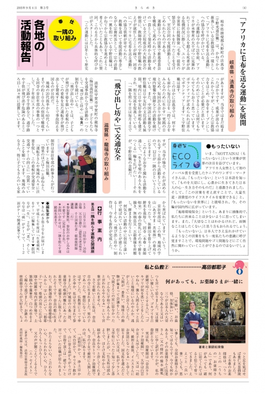 「アフリカに毛布を送る運動」を展開~岐阜県・法真寺の取り組み|「飛び出し坊や」で交通安全~滋賀県龍福寺の取り組み|【身近なECOライフ】もったいない|【私と仏教(2)】何があってもお薬師様が一緒に~高田都耶子(エッセイスト)