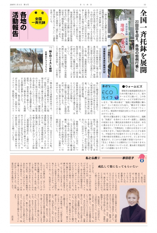 20回目を迎え、各地の恒例行事に~京都教区本部托鉢同行記|「一隅を照らす木」を植樹~比叡山ドライブウエイ|【身近なECOライフ】ウォームビズ|【私と仏教(3)】成仏して楽になってもらいたい~家田荘子(作家)