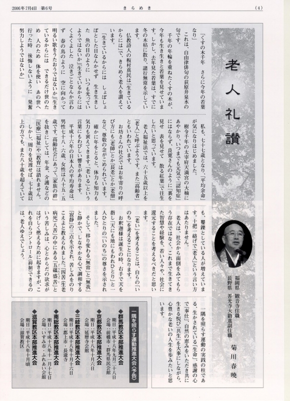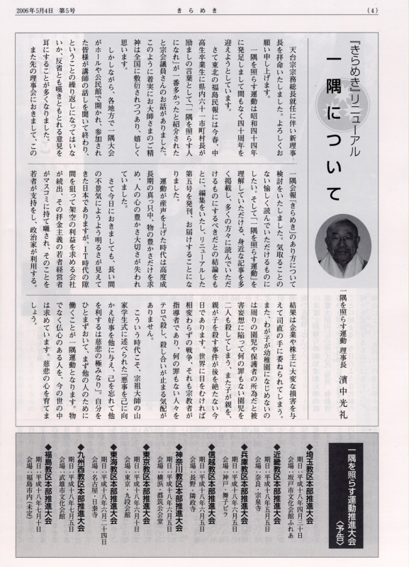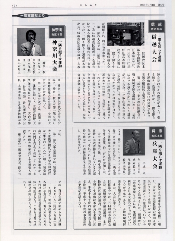 ~兵庫教区本部 一隅を照らす運動兵庫大会~ 平成18年6月5日、兵庫教区本部(草別碩善教区本部長)では | ~信越教区本部 一隅を照らす運動信越大会~ 信越教区本部(小山健英教区本部長)では6月5日に | ~神奈川教区本部 一隅を照らす運動神奈川大会~ 神奈川教区本部(大久保良允教区本部長)は、平成18年6月5日