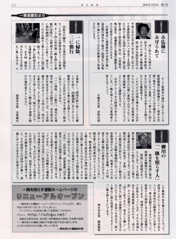 ~兵庫教区本部 み仏様にみ守られて~ 幼い時から仏様が大好きだった北井美紀子さん(70歳・日輪寺檀徒・神戸市西区在住) | ~九州西教区本部 柳川の「一隅を照らす人」~ 福岡県の柳川で観光ボランティア活動を積極的に行っている椛島清治さん | ~茨城教区本部 1に掃除、2に勤行~ 弁財天の縁日、先は境内のお掃除です。この4人は毎回決まってくる参拝者、そして一隅を照らす運動の会員|【一隅を照らす運動ホームページのリニューアルオープン】一隅を照らす運動ホームページがリニューアルとなり