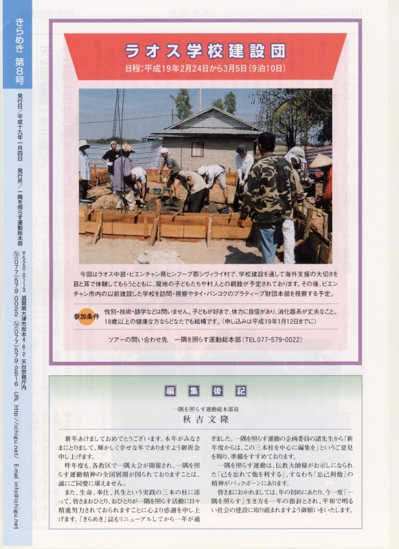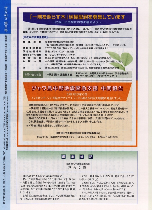 ~「一隅を照らす木」植樹里親を募集しています~ 一隅を照らす運動総本部では地球温暖化防止活動の一環 | ~ジャワ島中部地震緊急支援中間報告~ 一隅を照らす運動総本部「地球救援事務局」では、インドネシアに緊急支援を行うべく | 【編集後記】 一隅を照らす運動総本部長 秋吉文隆