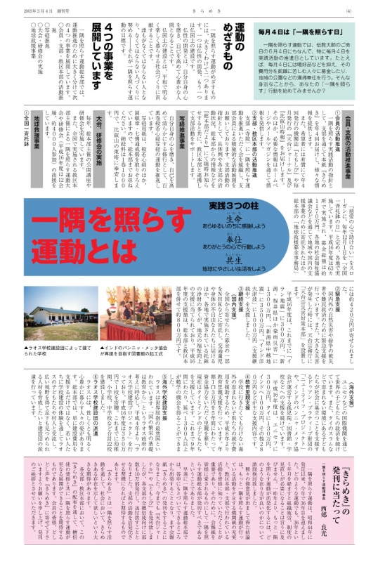 4つの事業を展開しています~「会員・支部の活動推進事業」「写経推進事業」「大会・研修会の実施」「地球救援事業」|『きらめき』の発刊にあたって~一隅を照らす運動理事長・西郊良光