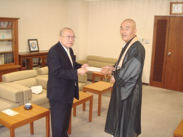 平成21年7月23日、神奈川教区圓満寺住職・西郊良光師(一隅を照らす運動顧問)が来庁され、シェーメン小学校図書室建設支援金70万円を秋吉文隆総本部長に手渡された。