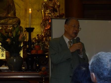 第1部では、溝江教区本部長導師のもと法要があり会場全体で唱和した。続いて、溝江教区本部長、福惠善高総本部長が挨拶を述べられた。