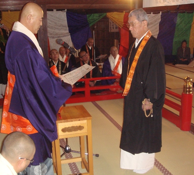 続いて、一隅を照らす運動実践者の表彰があり、昭和53年から継続して写経に取り組んでいる圓満寺写経会に理事長賞が、また写経会発起人で圓満寺檀徒の大島義久氏に総本部長賞が贈られ、秋吉総本部長から表彰状がそれぞれに手渡された。