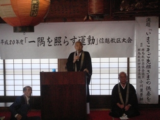 第2部では、天台宗群馬教区妙見寺住職の小川晃豊師を講師に迎え「いまこそご先祖さまの供養を」と題した講演が行われた。身近に出来ることは「先祖を大事にすること」「それには先ず我々が形に現すことです」と講演。