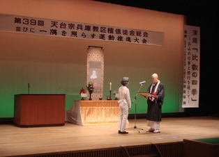 第1部では、雅楽をともなった天台声明講演・神田秀順大僧正を御導師のもと教区によるおつとめ・和讃奉詠などがあり、杜多道雄前教区本部長による「一隅運動のすすめ」と題したお話があった。