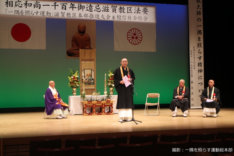 はじめに山岡智恢教区本部長導師のもと相応和尚一千百年御遠忌滋賀教区法要が厳修され、終了後挨拶がなされた。続いて、森定慈仁一隅を照らす運動総本部長より支部活動助成金認定証交付、滋賀教区本部長より支部活動助成金滋賀教区認定証交付と実践者表彰がなされた。来賓祝辞では一隅を照らす運動総本部長より、2年後に迎えます「一隅を照らす運動」発足50周年への心意気と企画、若年層への思い、仏教徒の使命と心のあり方・行動、平成29年8月に完成した「しょうぐうさん体操」をご挨拶にて述べられました。