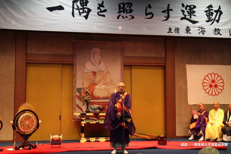 第1部の始めに、岩田教区本部長を御導師に参加者全員で法楽が行われた。続いて、岩田教区本部長より主催者の挨拶、来賓の小山健英信越教区布教師会長より祝辞があった。その後、「一隅を照らす運動」について、横山照泰一隅を照らす運動総本部長より参加者に向けて講話が行われた。
