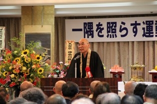 午後1時からは推進大会に移り、穴穂教区本部長、来賓の福惠善高同運動総本部長が挨拶した。引き続き法相宗大本山薬師寺管主山田法胤師を講師に迎え、「人生の生き方」と題した講演があった。山田師は「喜んで与える人間となろう。それこそが一隅を照らすということです。」と仏教の教えを俳句や川柳を交えながらわかりやすくお話された。山田師のユーモア溢れる法話に、会場からは笑いが絶えなかった。