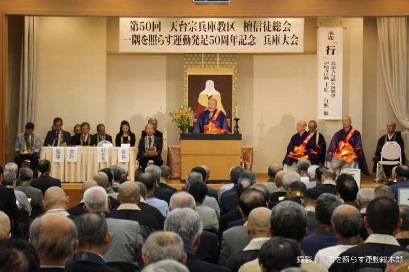 令和元年6月12日、兵庫教区本部(荒樋勝善教区本部長)では、兵庫県篠山市のユニトピアささやまを会場に一隅を照らす運動発足50周年記念兵庫大会を開催し、約300名の参加者が集まった。