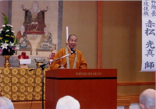 6日午後1時より根本中堂に於いて、羽生田教区本部長を導師に教区寺院住職出仕のもと『宗祖降誕会』が厳修され、午後2時45分から会場を延暦寺会館に移し、『一隅を照らす運動推進大会』として来賓の濱中光礼宗務総長をはじめ、教区本部長・檀信徒会会長の挨拶に引き続き、延暦一山金台院住職で居士林所長の赤松光真師を講師に迎えて、「お大師さまのみこころ」と題して講演が行われた。