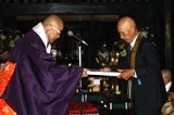 第1部では、埼玉教区法儀研究会による法華三問一答、「天台宗在家勤行儀」を用いた参加者全員による法楽の後、一隅を照らす運動総本部長・秋吉文隆師より一隅を照らす運動を長年実践されている2名の檀信徒の表彰があった。
