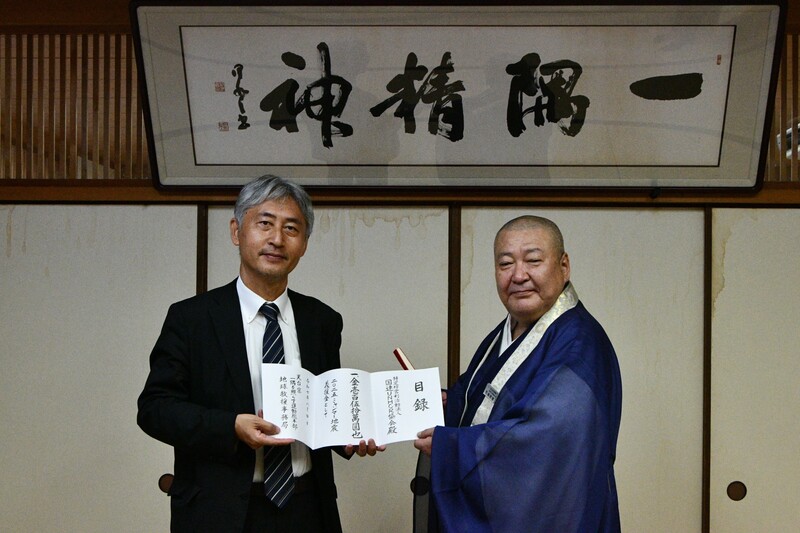一隅を照らす運動理事長代理 荒樋勝善総本部長、同運動副理事長 獅子王圓明延暦寺執行からそれぞれ目録が手渡されました。