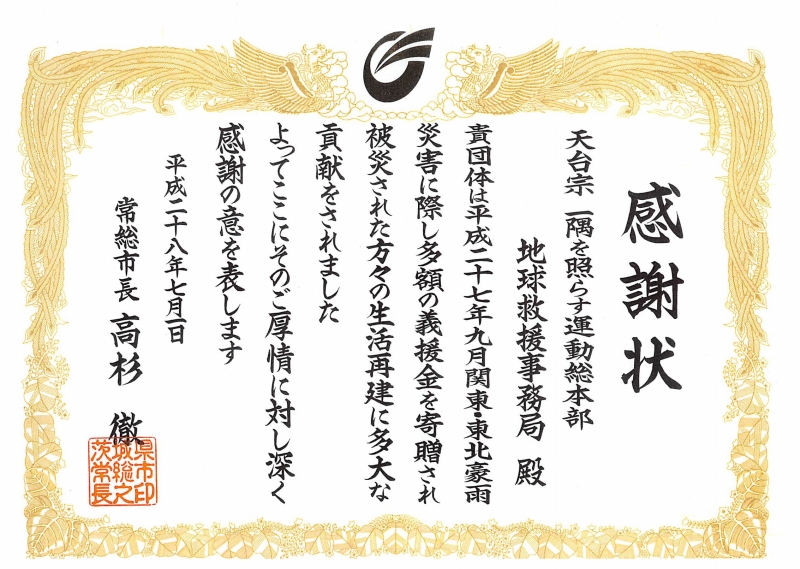 茨城県常総市より感謝状をいただきました