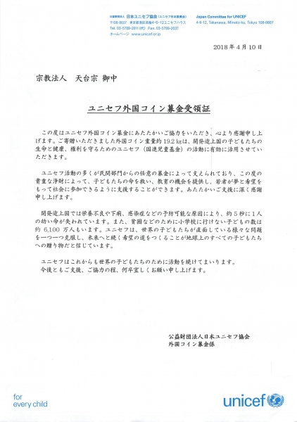 公益財団法人日本ユニセフ協会からお礼状をいただきました