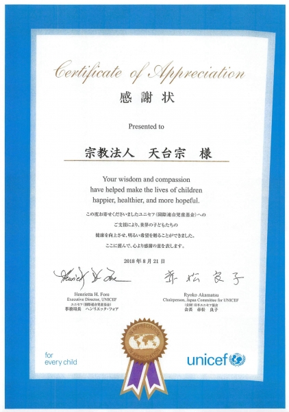 ユニセフより感謝状をいただきました