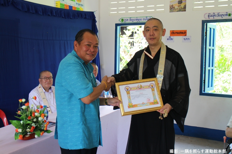 最後にチェンカン村があるチャンパサック県プウントン郡の副教育長シーサワット氏から謝辞があり、森定総本部長に感謝状が贈呈されて式典は終了となった。