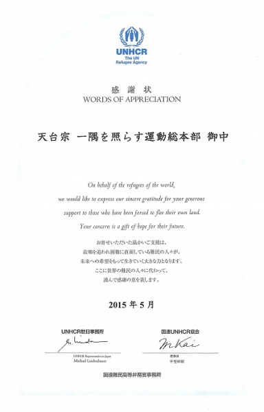 国連高等弁務官事務所(UNHCR)より感謝状をいただきました