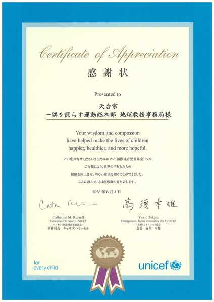 令和7年8月4日(月)、比叡山宗教サミット38周年「世界平和祈りの集い」(比叡山延暦寺)が開催され、その開式前に一隅を照らす運動総本部地球救援事務局より日本ユニセフ協会様へ支援金および義援金の寄託式を行いました。