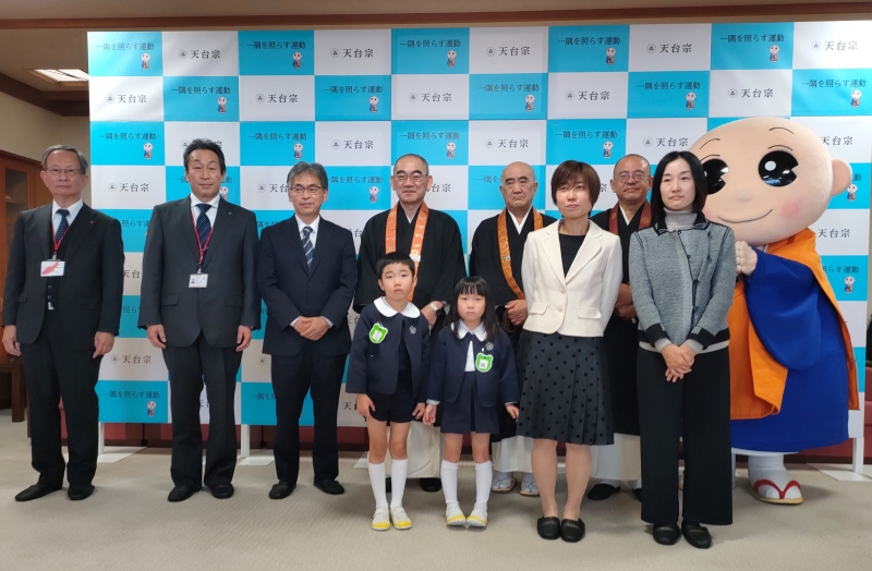 社会福祉法人滋賀県共同募金会から森尚一常務理事・事務局長、日本赤十字社滋賀県支部から西出佳弘事務局長、NHK大津放送局から手島一宏局長に来庁いただき、一隅を照らす運動水尾寂芳副理事長、同運動理事長代理・天台宗参務小林祖承総務部長からそれぞれ目録が手渡された。