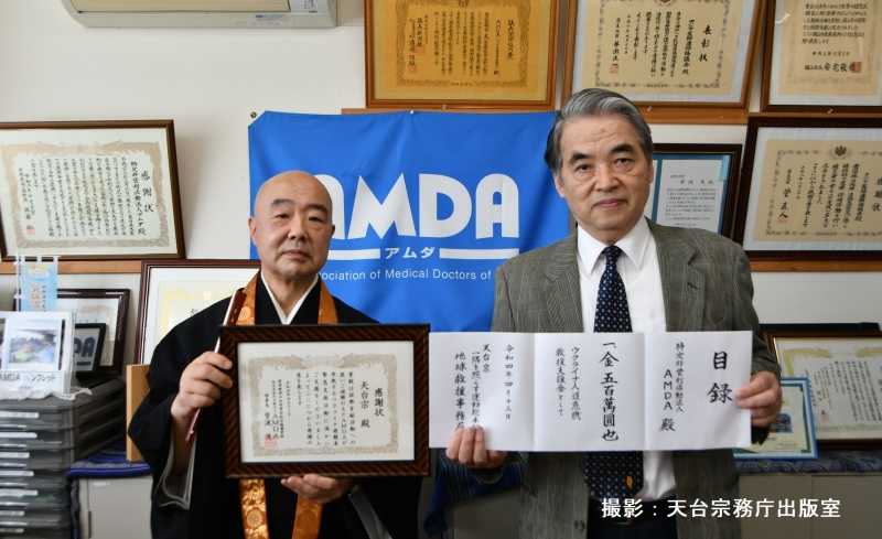 当日は、アムダ菅波 茂理事長へ竹内純照総本部長が500万円の目録を手渡し、同日、支援金に対しまして感謝状をいただきました。