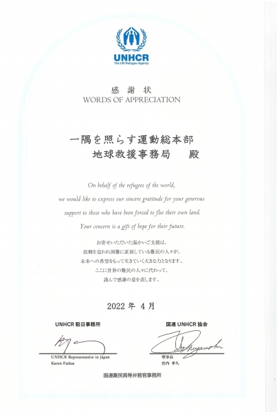 4月に国連UNHCR協会へ寄託いたしました。この度、感謝状をいただきましたのでご報告いたします。