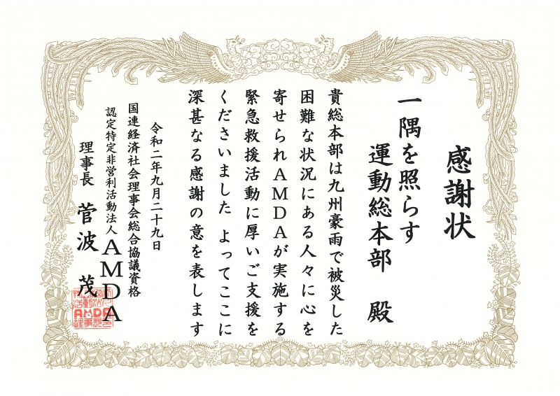 特定非営利活動法人AMDAより感謝状をいただきました!