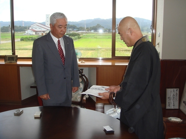 当日は、NHK大津放送局から三原渡局長が来庁し、濱中光礼一隅を照らす運動理事長と清原惠光延暦寺執行(一隅を照らす運動副理事長)がそれぞれ義援金を手渡した。