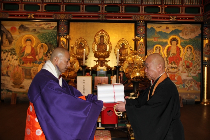 一隅を照らす運動で推進を行っている「百萬巻写経」として、平成27年度中に総本部へ納められた2,905巻が横山照泰一隅を照らす運動総本部長から小寺照依延暦寺法務部長に写経が手渡された。