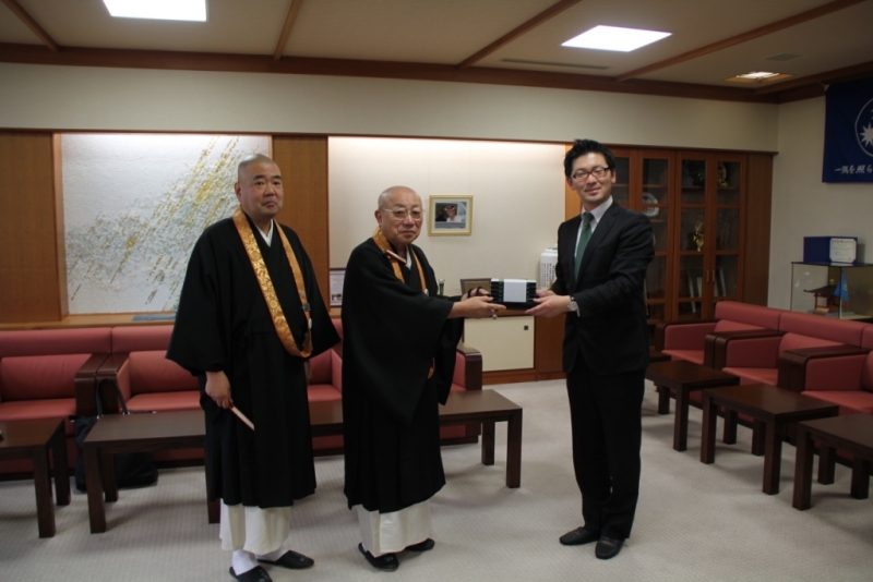 半田座主は、WCRPの杉谷義純評議員や委員の方から署名の趣旨説明を受け、署名用紙に氏名を墨書された。「オバマ大統領が核兵器削減を宣言されたように、この世界から核兵器がなくなり、一刻も早く貧困や飢餓のない平和な世界が実現されることを心より祈り、この署名運動が世界中で行われることを念願します」と話した。