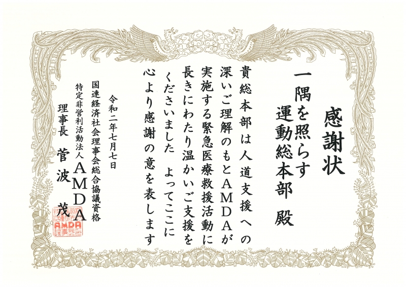 特定非営利活動法人AMDAより感謝状をいただきました!