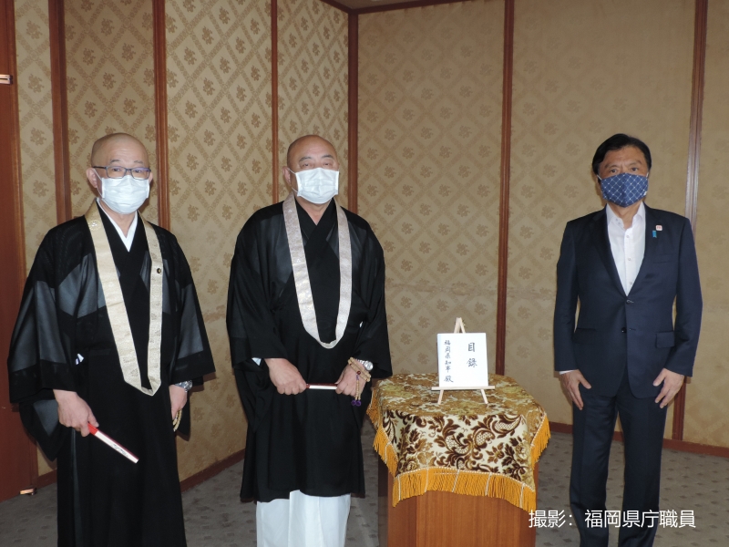 令和2年9月25日(金)、甘井亮淳天台宗参務財務部長、藤光俊九州西教区宗議会議員が福岡県庁を訪れ、みな様からお預かりしております令和2年7月豪雨災害義援金の一部から支援金を、福岡県知事小川洋氏に寄託しました。