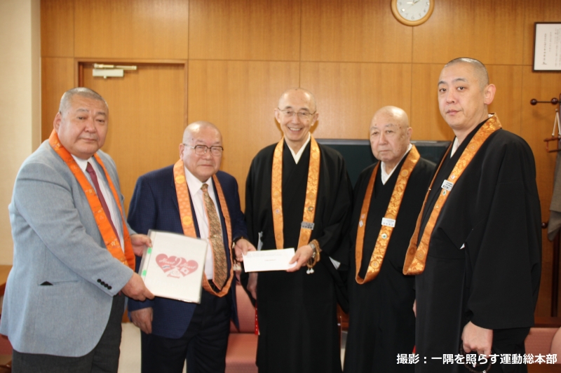 令和2年1月9日、三千院門跡の穴穂行仁執事長、宇田泰観総務部長が天台宗務庁に来庁し、一隅を照らす運動総本部へ61万1148円の浄財が寄託された。