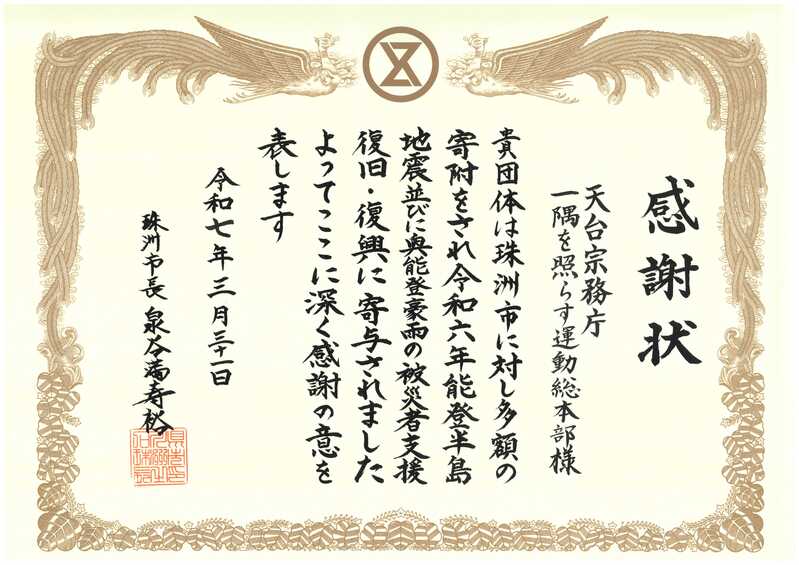 石川県珠洲市より感謝状をいただきました!