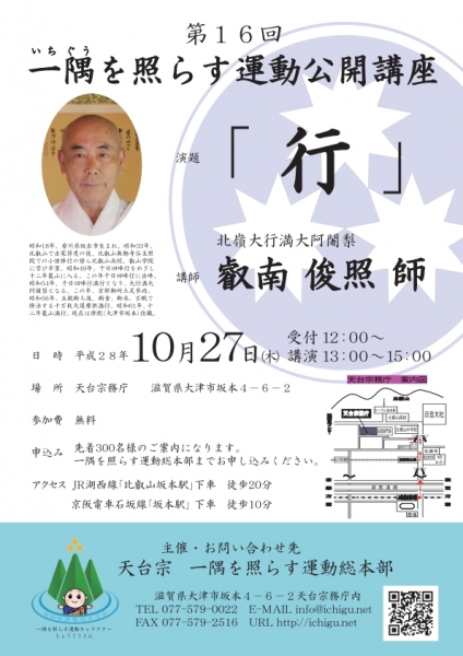 「一隅を照らす運動総本部」ではこの度、北嶺大行満大阿闍梨(天台宗延暦寺一山律院住職)の叡南俊照師を講師にお迎えして「第16回一隅を照らす運動公開講座」を開催いたします。