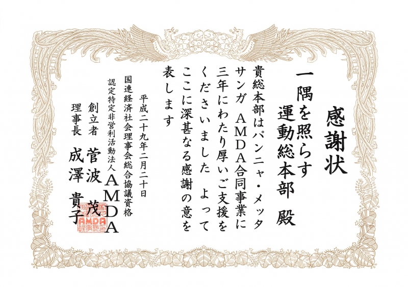 AMDAより感謝状をいただきました