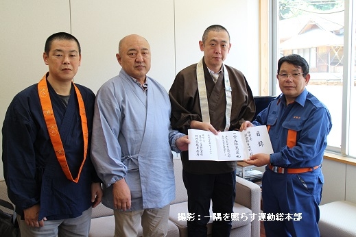 平成29年7月13日(木)、森定慈仁一隅を照らす運動総本部長、甘井亮淳天台宗参務財務部長並びに嘉瀬慶文九州西教区本部長が福岡県朝倉市、福岡県東峰村、大分県日田市の市役所・村役場を訪れ、みな様からお預かりしております救援協力金の一部から、7月5日より発生した大雨災害に対する支援金を寄託しました。