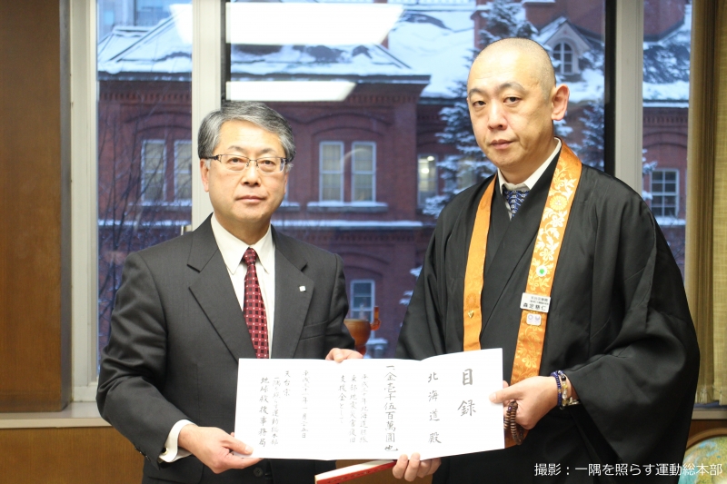 平成31年1月25日(金)、森定慈仁一隅を照らす運動総本部長が北海道庁を訪れ、みな様からお預かりしております平成30年北海道胆振東部地震災害緊急救援募金の一部から支援金を、北海道副知事阿部啓二氏に寄託しました。