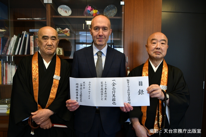令和5年4月17日、天台宗宗務総長代理 参務小林祖承総務部長、竹内純照一隅を照らす運動総本部長は駐日トルコ大使館(東京都渋谷区)を訪問し、「トルコ・シリア地震災害義援金」として1,000万円を寄託いたしました。