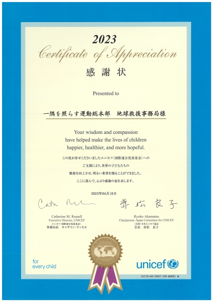 日本ユニセフ協会より感謝状をいただきました!