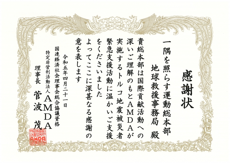 トルコ・シリア地震災害義援金としてお預かりしておりました浄財の一部を特定非営利活動法人AMDAへ寄託いたしました。この度、感謝状をいただきましたのでご報告いたします。