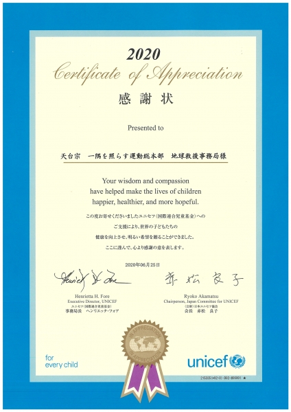 ユニセフより感謝状をいただきました!