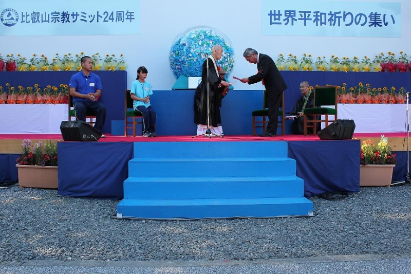 12日には、今回の「第25回世界宗教者平和の祈りの集い」天台宗代表使節団団長を務めた栢木寛照団長が、ミュンヘンのシティセンターホールで「大震災における宗教者の役割り」についてスピーチをした後、聖エジディオ共同体のアゴスティーノ・ジョバンニョーリ教授に共同体活動支援金として30万円を手渡した