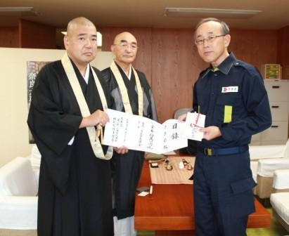 当日は、NHK大津放送局から辻田和則局長らが来庁し、阿純孝一隅を照らす運動理事長、武覚超同運動副理事長がそれぞれ義援金を手渡した。歳末たすけあいには、同月1日に比叡山山麓坂本で行われた「天台宗全国一斉托鉢」の浄財463,243円が、海外たすけあいには地球救援事務局から100万円が寄託された。