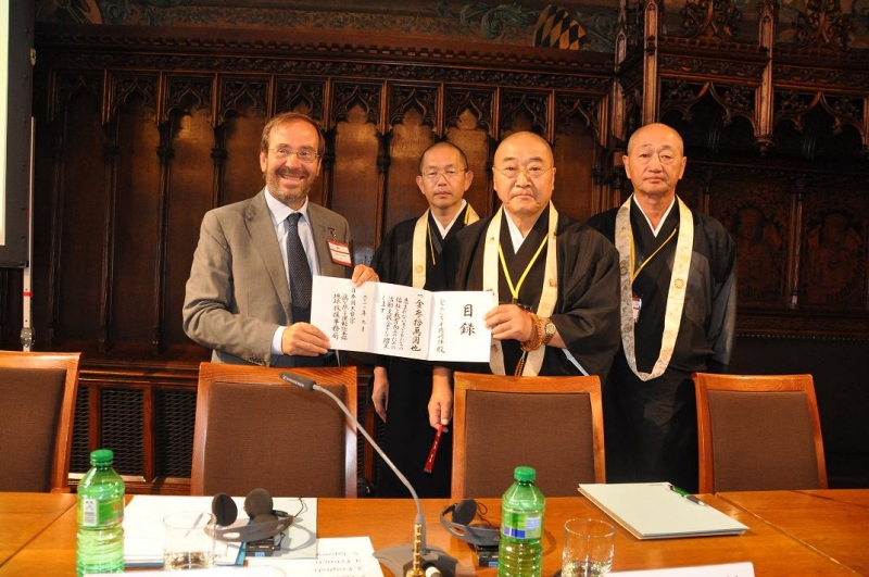 12日には、今回の「第25回世界宗教者平和の祈りの集い」天台宗代表使節団団長を務めた栢木寛照団長が、ミュンヘンのシティセンターホールで「大震災における宗教者の役割り」についてスピーチをした後、聖エジディオ共同体のアゴスティーノ・ジョバンニョーリ教授に共同体活動支援金として30万円を手渡した