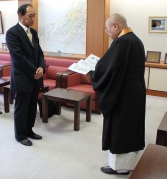 当日、NHK大津放送局から亀井保樹局長らが来庁し、阿純孝同運動理事長、武覚超同運動副理事長がそれぞれ義援金を手渡した。歳末たすけあいには、同月1日に比叡山山麓坂本で行われた「天台宗全国一斉托鉢」の浄財417,591円が、海外たすけあいには地球救援事務局から100万円が寄託された。また、寄託式には延暦寺幼稚園から竹林幸祥園長先生と、園児と保護者6名も出席し、11月7日に行われた秋バザーの収益金が、園児達から亀井局長に手渡された。